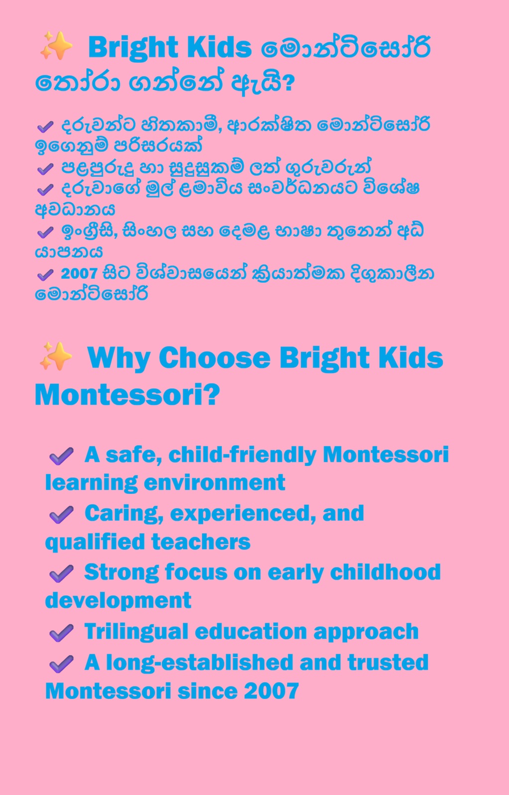 🌈 BRIGHT KIDS MONTESSORI – COLOMBO 05 🌈 👉 2026 වර්ෂය සඳහා ඇතුළත් කිරීම් දැන් විවෘතයිAdmissions Open for Year 2026 A trusted place for your child’s early learning journey since 2007. 👶 Classes & Age Groups• Play Group: 2 – 3 years• L.K.G.: 3 – 4 years...