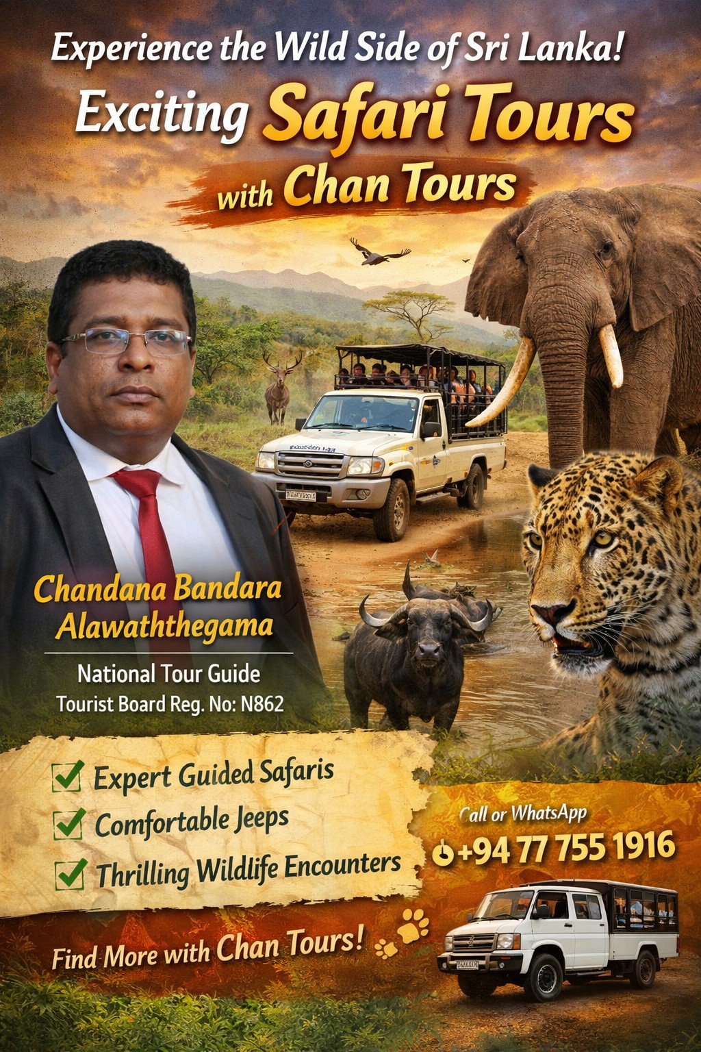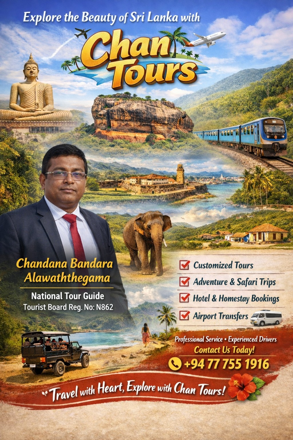 🌍✨ Discover the Beauty of Sri Lanka with Chan Tours Looking for a trusted and experienced travel partner?Chan Tours is here to make your journey unforgettable! 🌴🚐 👨✈️ National Tour Guide:Chandana Bandara Alawaththegama📌 Tourist Board Registration No...