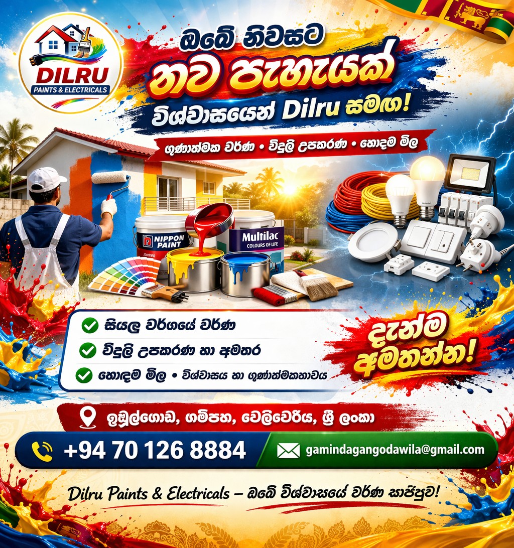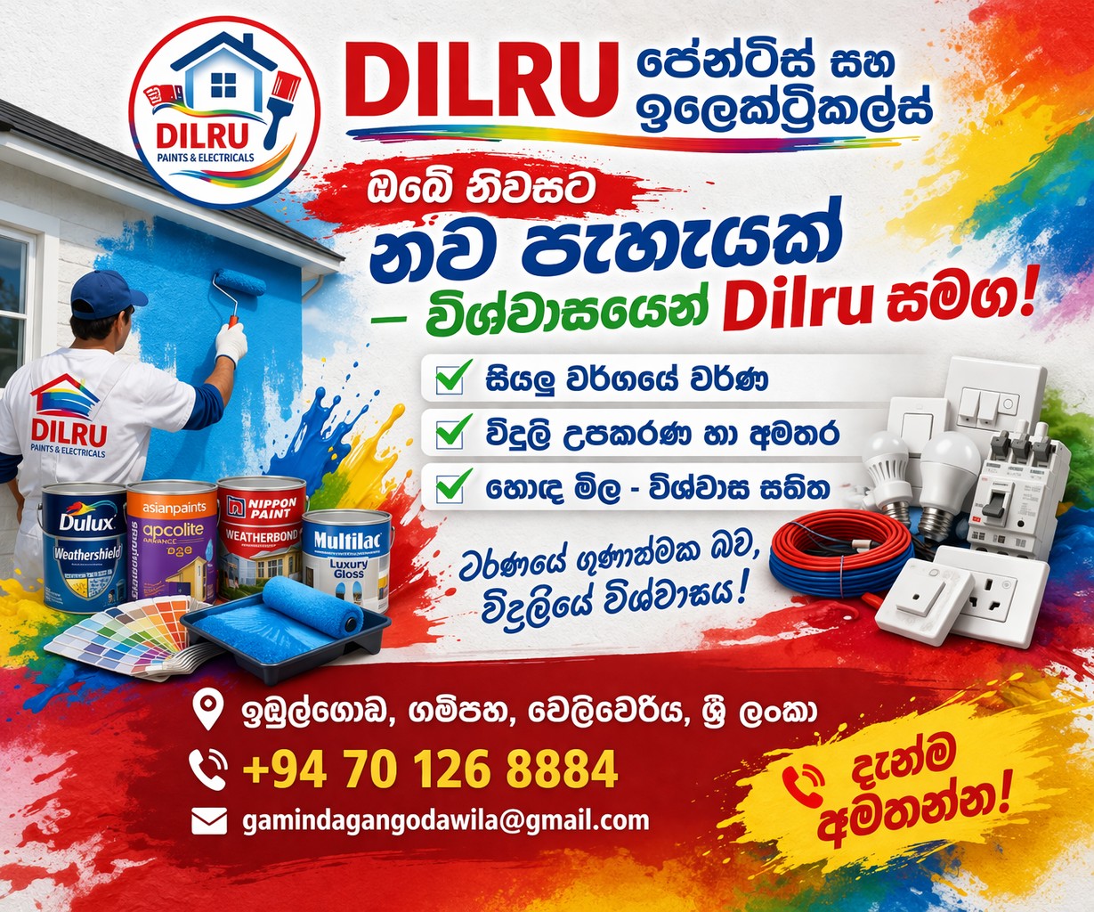 🎨⚡ Dilru Paints & Electricals ⚡🎨ඔබගේ ගෙදරට, කාර්යාලයට, හෝ ව්යාපාරයට අවශ්ය සියලුම Paint & Electrical විසඳුම් එකම තැනකින්! 🏠✨ ඔබේ සිහින නිවසට ලස්සන පාටක් දාගන්න🔌💡 නවීන විදුලි උපකරණ සමඟ ආරක්ෂිත ජීවිතයක්🎯 ගුණාත්මක භාණ්ඩ – සාධාරණ මිලට 👉 අප වෙතින් ඔබට:🎨 ...