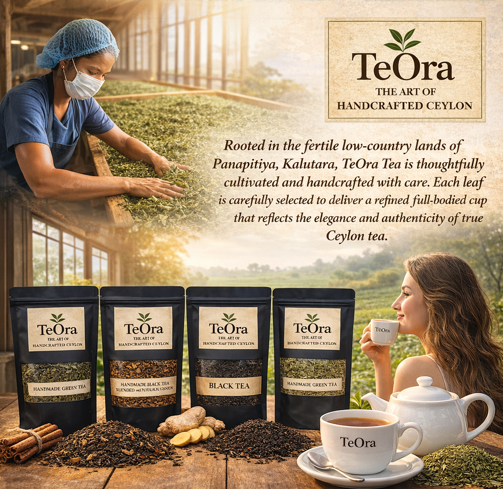 TeOra is a premium, handcrafted tea brand under Nominya Plantations and Exports, produced in small batches at our own plantation in Panapitiya, Kalutara Sri Lanka. Using freshly plucked leaves grown on our land, every step, from rolling to drying, is done by hand, following traditional Sri Lankan tea-making methods.